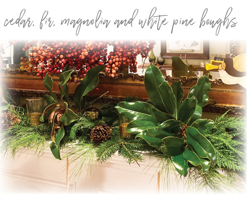 Add a small cluster, (one bud) of magnolia every so often to add height to your mantle display, hiding the end or cut side of the evergreen branches. You can also nestle lanterns, candlesticks, frames, Santas or other decorations amongst the greenery using them to cover the origin of the cut branches.