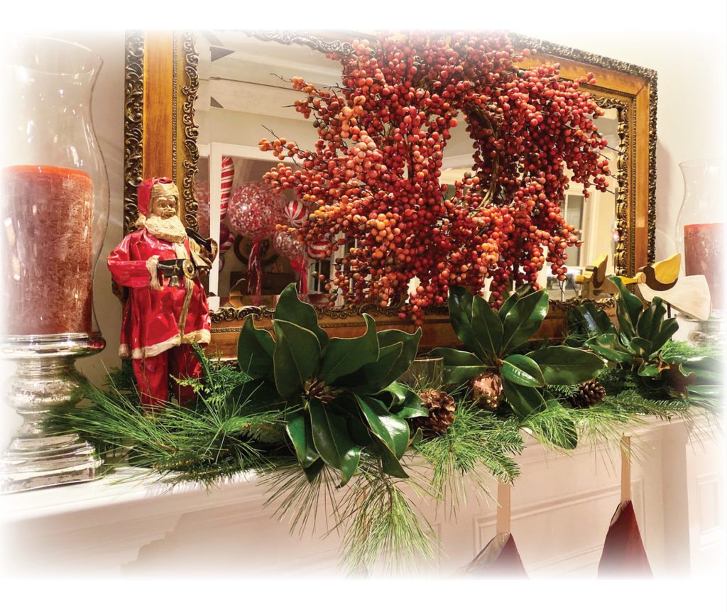 Add a small cluster, (one bud) of magnolia every so often to add height to your mantle display, hiding the end or cut side of the evergreen branches. You can also nestle lanterns, candlesticks, frames, Santas or other decorations amongst the greenery using them to cover the origin of the cut branches.