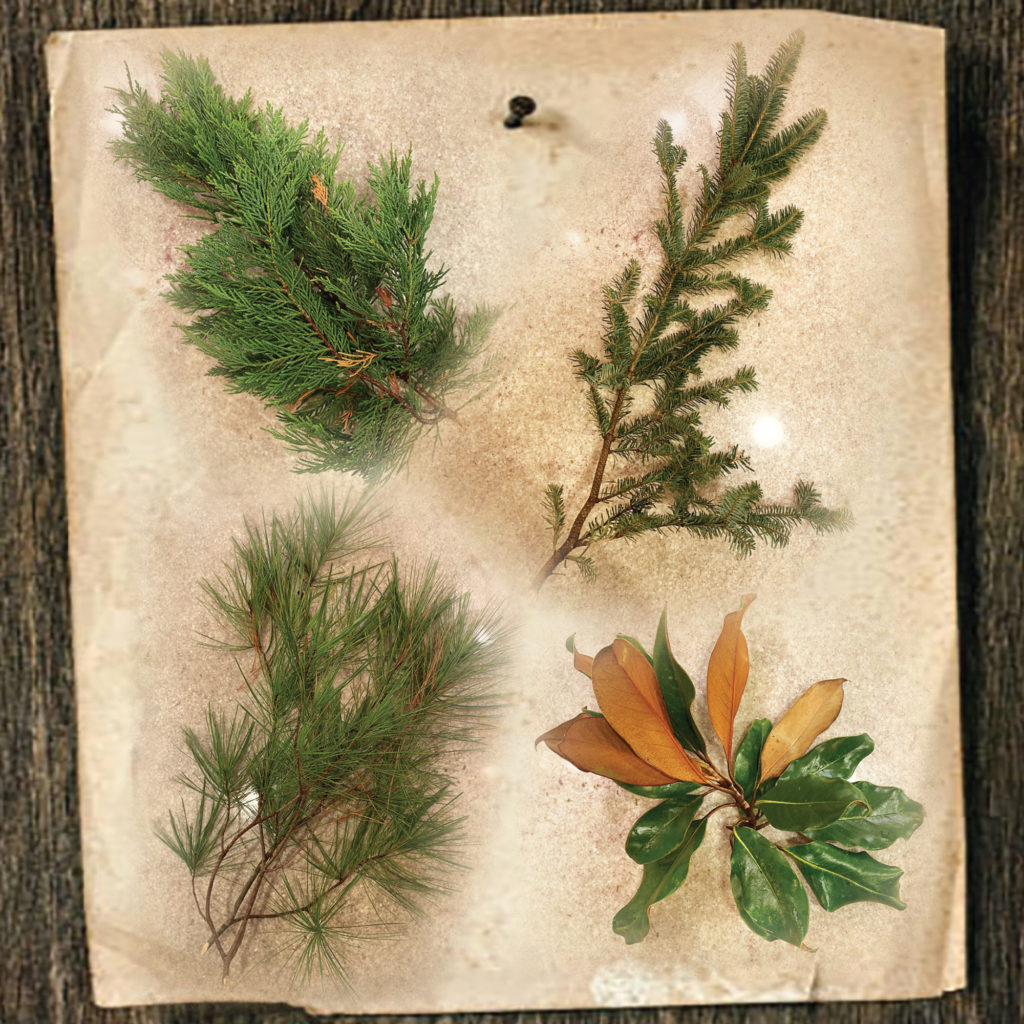 Starting from the bottom up, a little goes a long way. When clipping, you’re looking for long, flat pieces cut from the ends of low branches. I like to use them as the first layer on my surface as the spiny needles do a good job laying flat and peeking through. Pines are accustomed to leaking sap drips so be mindful of unprotected surfaces. I like to place a runner on my table just in case.