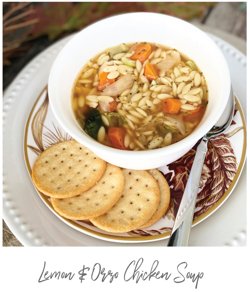 One of the best remedies I’ve found is this power-packed chicken soup. The broth and lemon are perfect to ward off the coming cold. For a unique twist, the noodles are substituted with orzo pasta. Yum-mo!